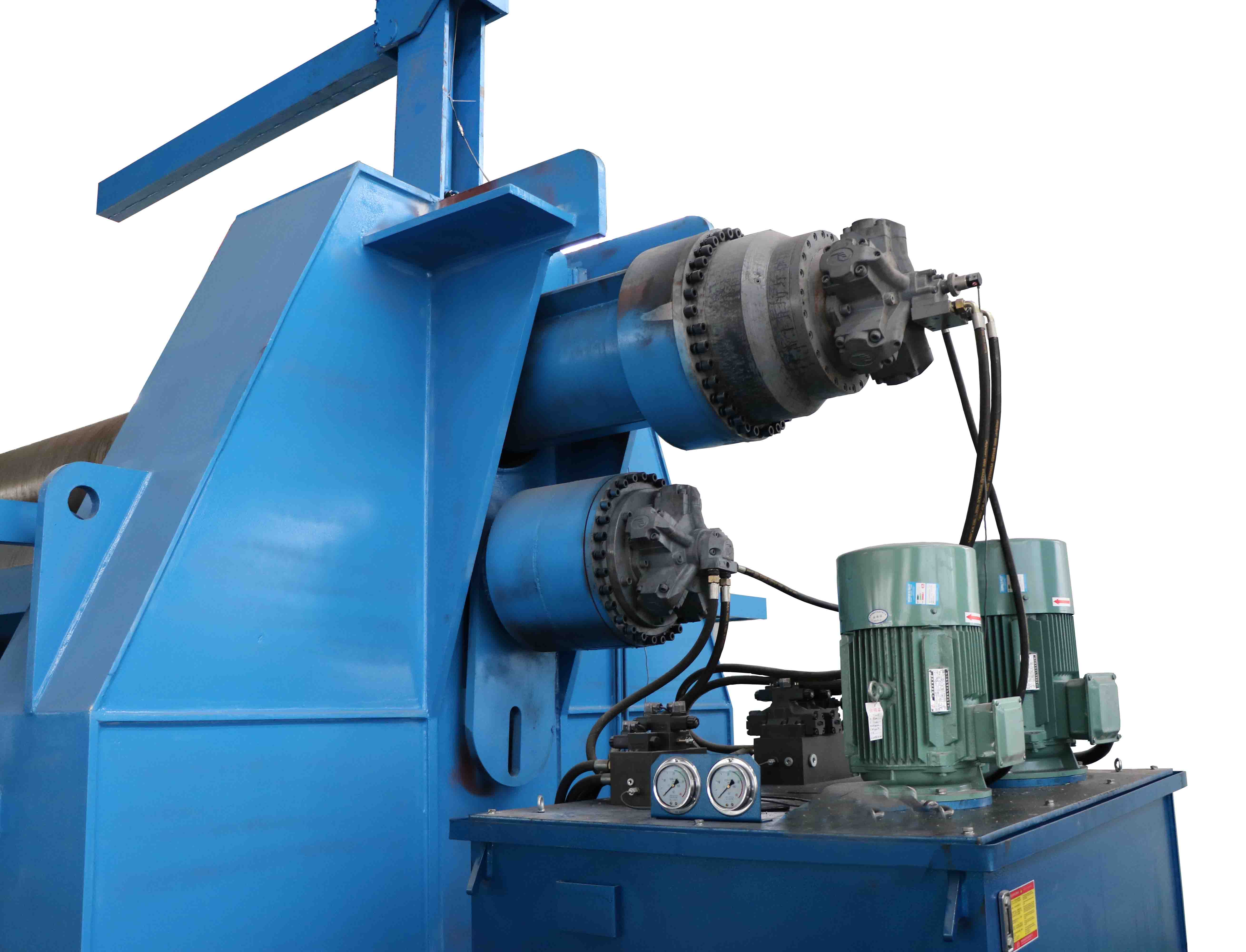 卷板機是一種將金屬板材卷彎成筒形、弧形或其它形狀工件的通用設備。 卷板機的運動形式可以分為主運動和輔運動兩種形式的運動。主運動是指構成卷板機的上輥和下輥對加工板材的旋轉、彎折等運動,主運動完成卷板機的加工任務。輔運動是卷板機在卷板過程中的裝料、下料及上輥的升降、翹起以及倒頭架的翻轉等形式的運動。四輥卷板機上輥為主動輥,下輥和側輥為從動輥,上輥位置固定,下、側輥可升降移動,上輥為液壓馬達傳動,下、側輥的轉動是靠鋼板和各輥間的摩擦力帶動的。下輥和側輥均由其兩端油缸推動其實現升降運動。上輥前側軸承體的翻轉、復位由翻倒油缸執行,各輥軸承體和油缸均裝于左、右兩端的機架內。