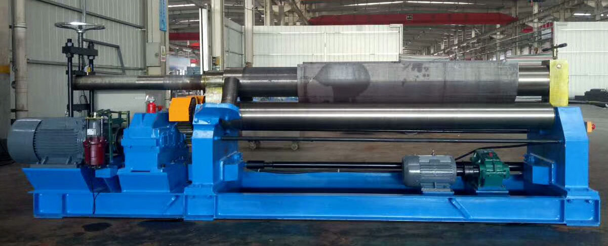 W11-12x2000機械對稱式三輥卷板機是全機械式三彎板機。 三個滾筒全部固定,像金字塔一樣放置。